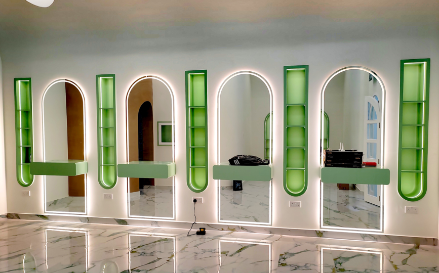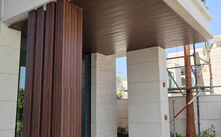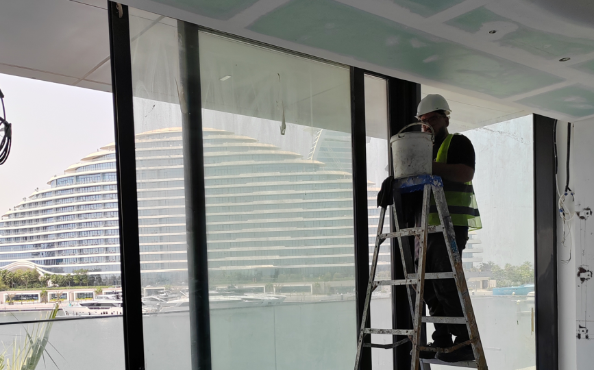 We engineered a high-performance Unitized Curtain Wall System using Solar Reflective Blue Glass to provide superior UV protection. For the solid areas, we installed Fire-Rated (A2 Grade) Aluminium Composite Panels (ACP). To ensure 100% weatherproofing, we utilized high-modulus structural silicone sealants specifically designed to resist the high wind pressures and sandstorms common in coastal Marina regions.